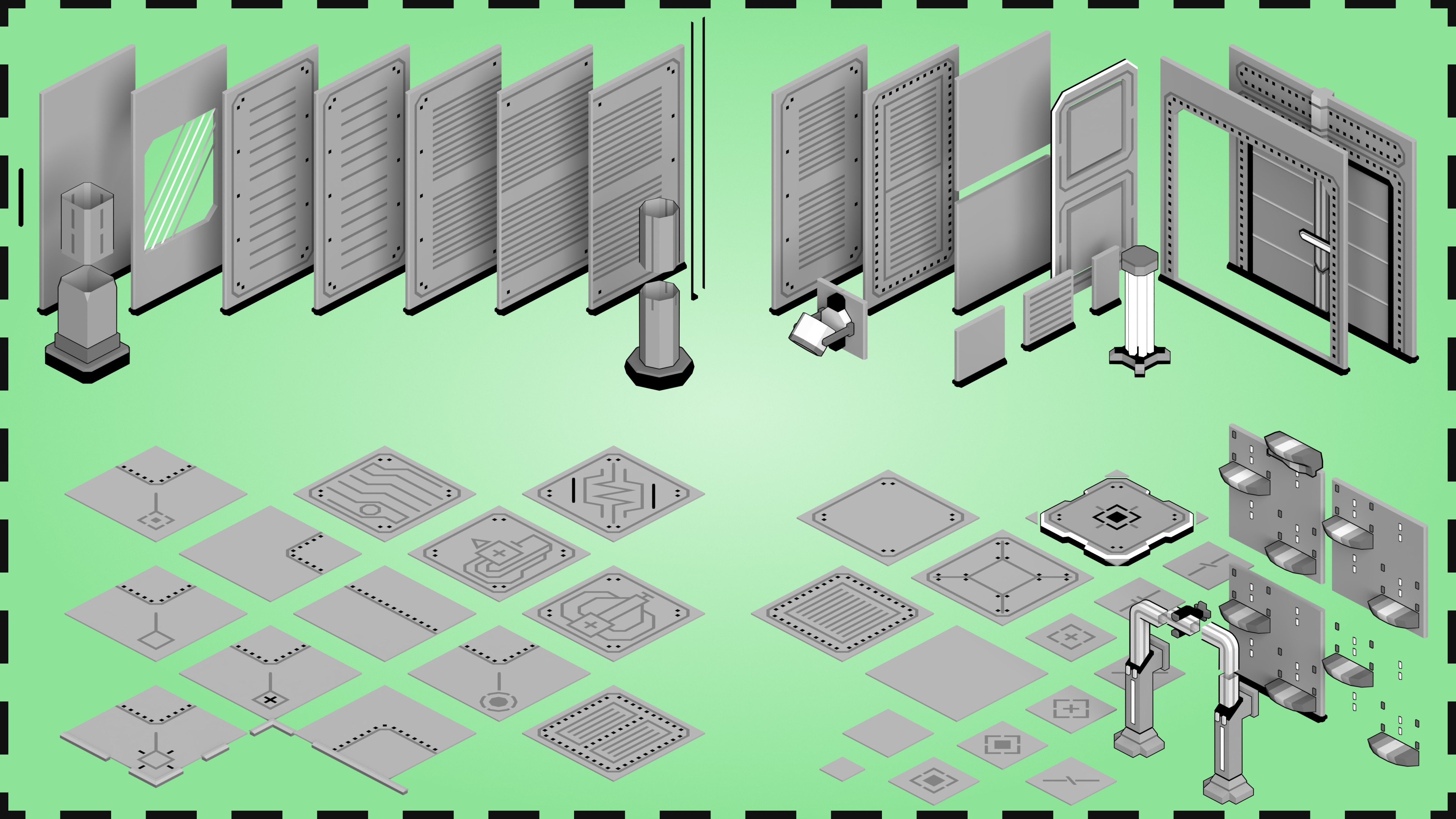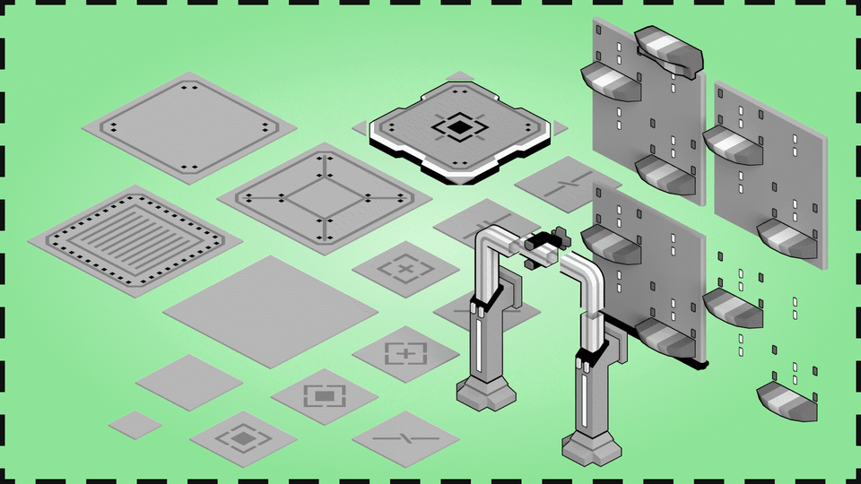 This asset includes a modular sci-fi environment set with floor tiles, walls, ledges,
